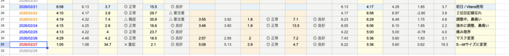 この1週間、ただ使い続けたわけではありません。マスクの種類を変え、サイズを調整し、その結果がデータにはっきりと現れました。「合う・合わない」がこれほど数値に出るとは、正直思っていませんでした。