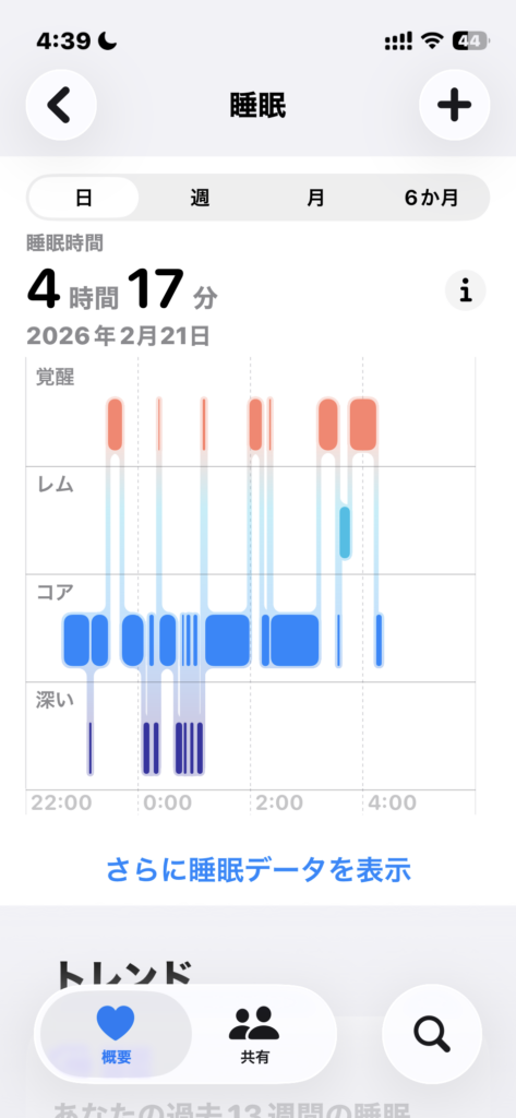 睡眠ステージのグラフを見ても、覚醒(赤)が複数回入り込んでおり、断片的な睡眠になっていることがわかります。