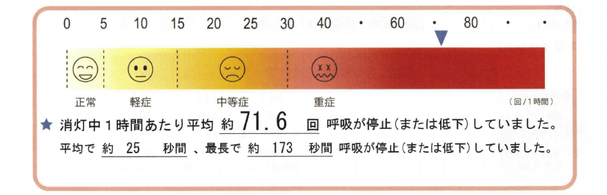 私の数値は1回目が71.6、2回目が69.8。重症の基準である30の、2倍以上。つまり1時間に70回以上、平均25〜31秒間呼吸が止まり続けていたことになります。